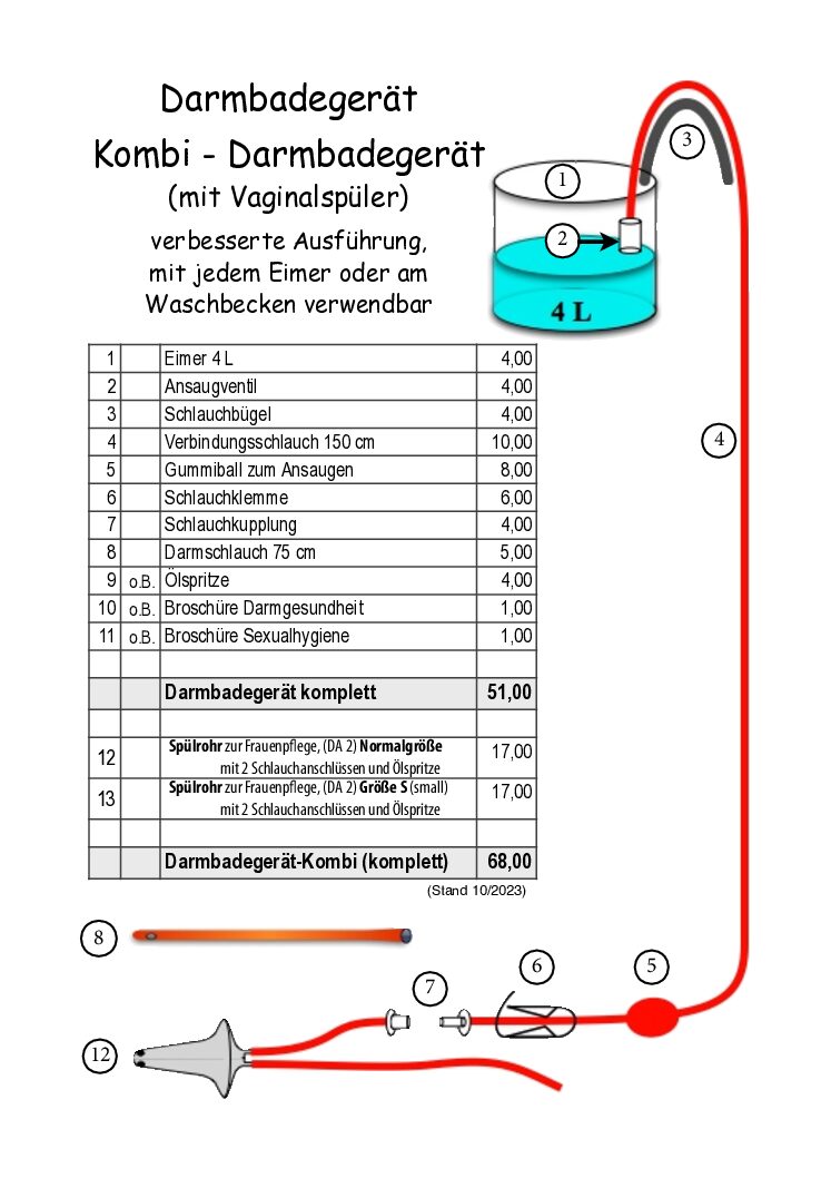 | Variationen | Darmbadegerät Standard, Darmbadegerät Kombi, Darmschlauch 75cm* 8mm, Ölspritze 20ml, 15cm, Vaginalspüler (normal), Vaginalspüler small (klein) |